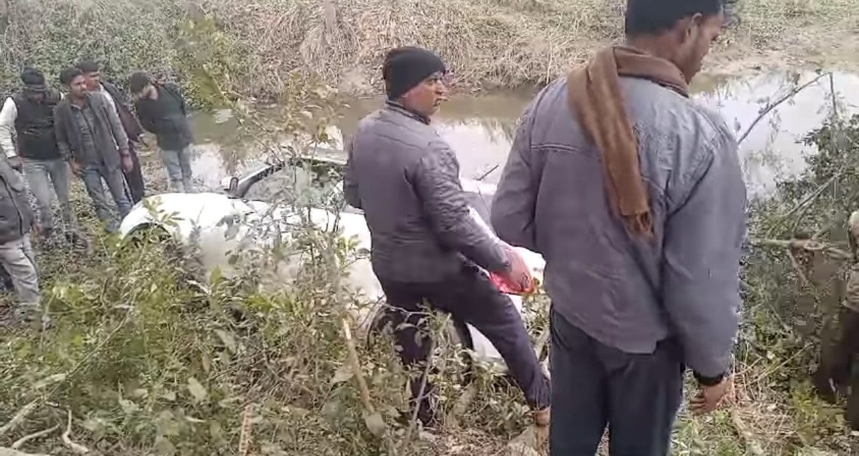 तेज रफ्तार कार अनियंत्रित होकर सडक किनारे गड्ढे के पानी मे पलटी…