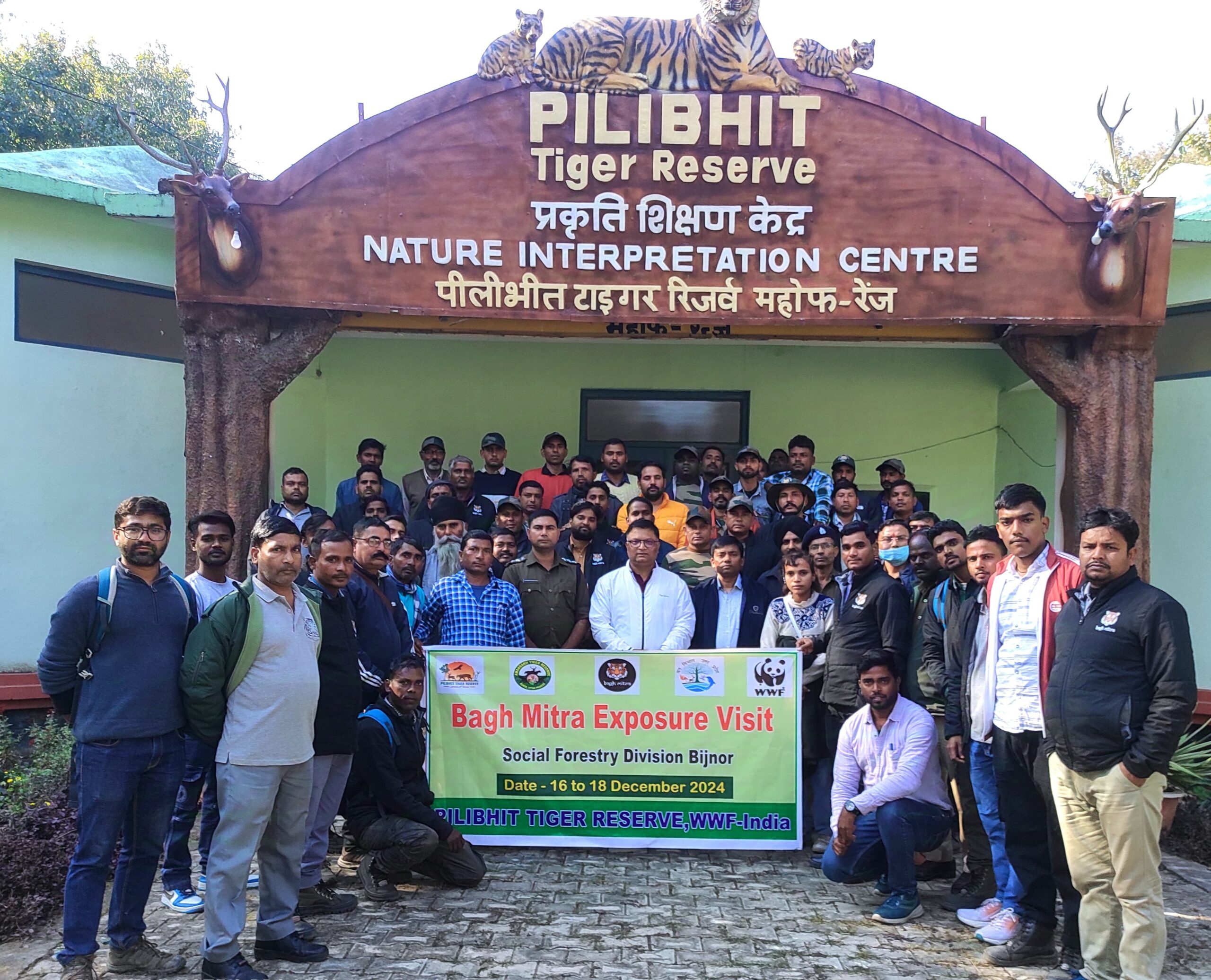 सामाजिक वानिकी वन प्रभाग बिजनौर के 20 बाघ मित्रों का दल पीलीभीत टाइगर रिजर्व में बाघ मित्र कार्यक्रम की बारीकियां सीखने के लिए तीन दिवसीय शैक्षणिक भ्रमण पर पीलीभीत टाइगर आया है। आज के कार्यक्रम का शुभारंभ बाघ मित्रों के द्वारा ग्राम सेला में वृक्षारोपण से किया गया। बाघ मित्रों ने सेला गांव एवं जंगल का भ्रमण कर वन्यजीवों के पद चिन्हों को पहचानने का प्रशिक्षण प्राप्त किया। दोपहर में ग्राम चौड़ा खेड़ा में विचरण कर रहे बाघ को देखा एवं ग्रामीणों से बात की तथा दोपहर में महोफ रेंज परिसर में बिजनौर के बाघ मित्रों एवं पीलीभीत के बाघ मित्रों का आपस में वार्तालाप हुआ। बाघ मित्र अतुल सिंह, सुमित्रा सिंह एवं अमन कुमार ने बताया कि पीलीभीत के बाघ मित्र किस प्रकार से कार्य करते हैं।