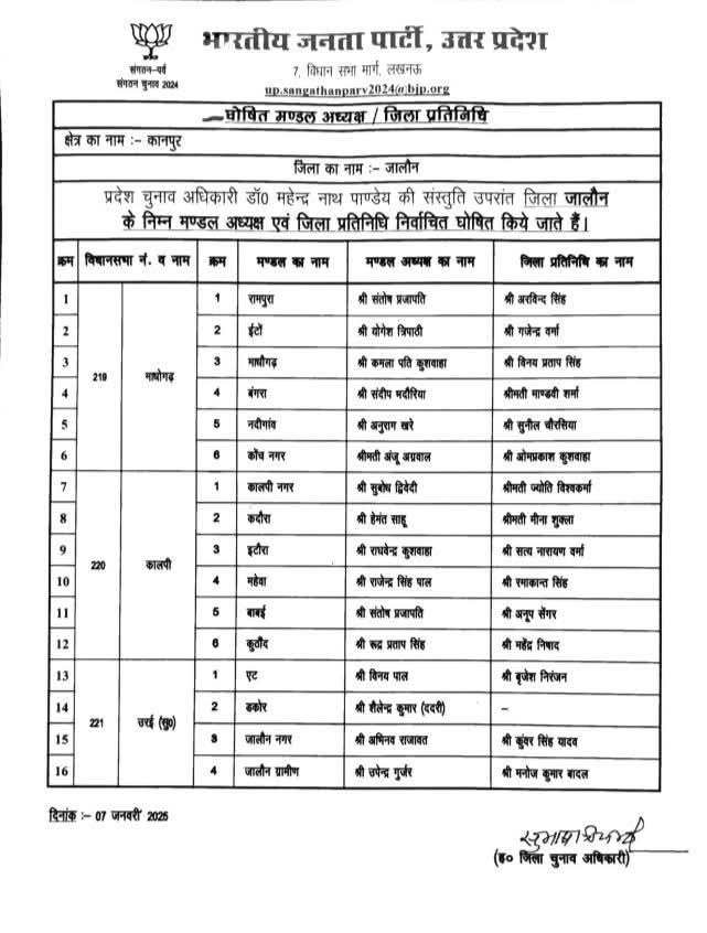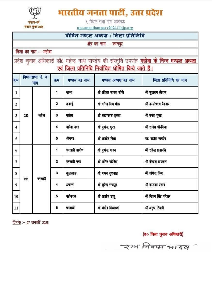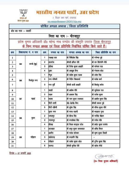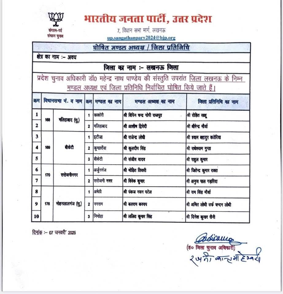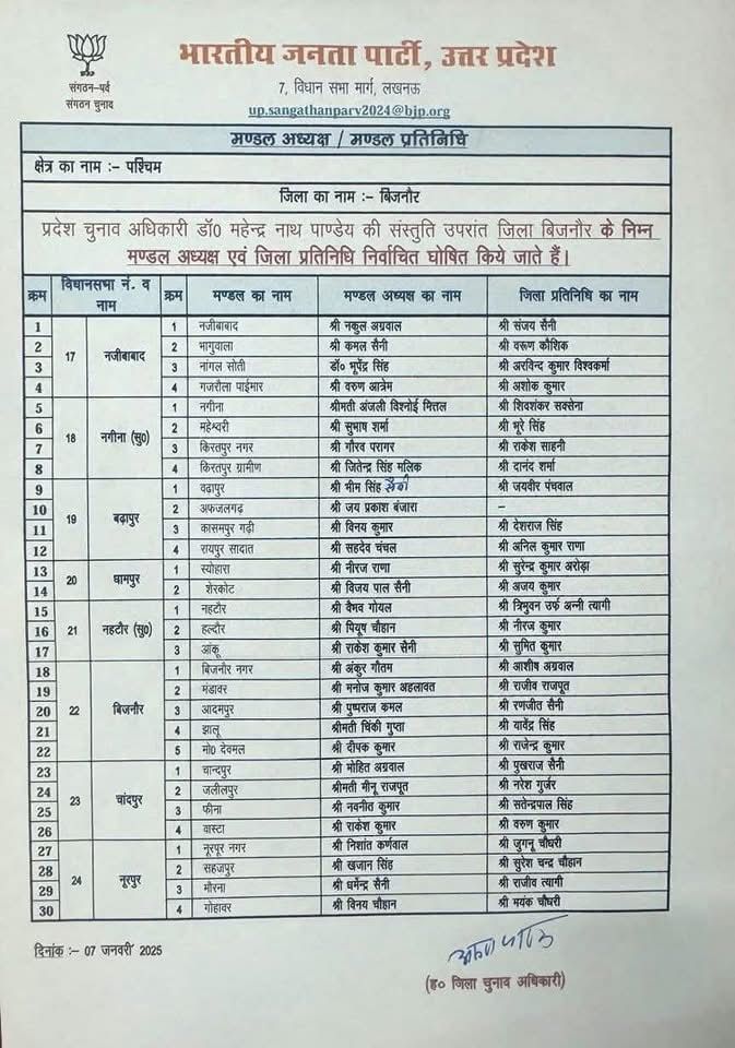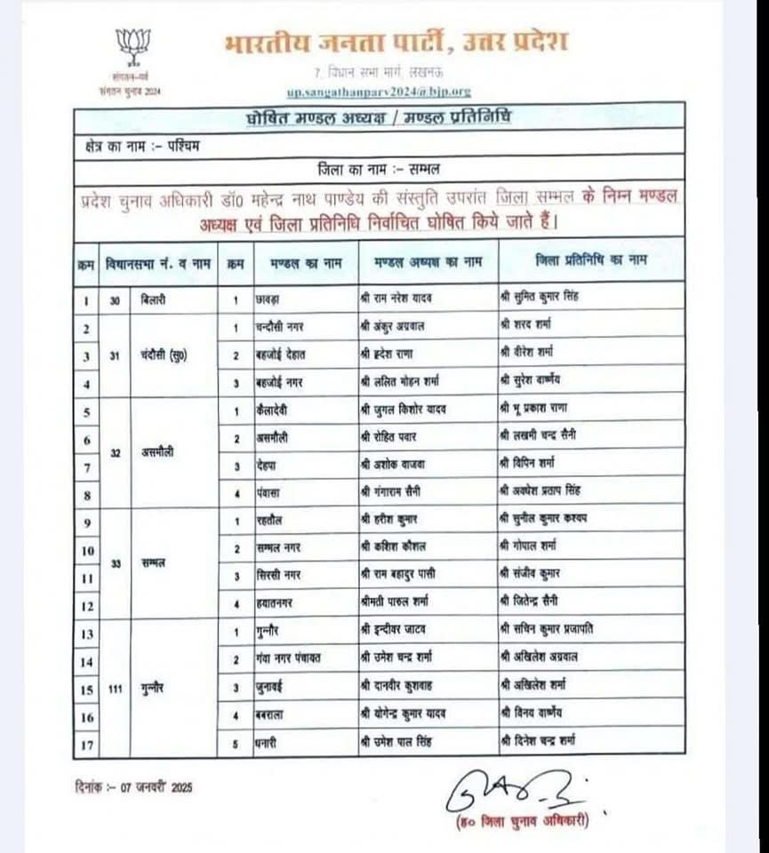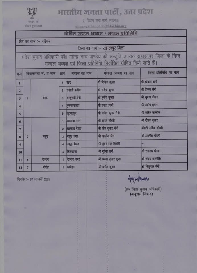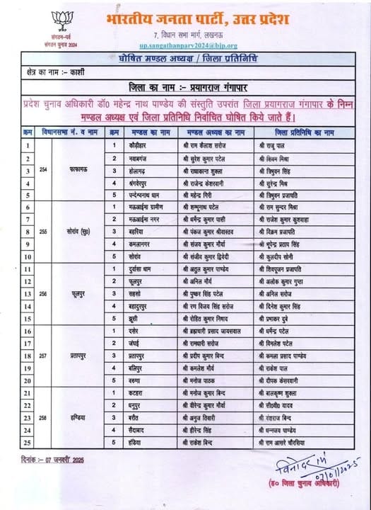 बस्ती/भाजपा ने प्रदेश के बाराबंकी,संभल,लखनऊ,सहारनपुर सहित आधे दर्जन जिलों के मण्डल अध्यक्षों की सूची जारी कर दिया है।जबकि बस्ती सहित एक दर्जनों से अधिक जिलों की सूची भाजपाइयों के आपसी जोर आजमाइश में रुकी हुई है।मंडल अध्यक्षों की सूची जारी न होने के कारण 7 से 10 जनवरी के नामांकन प्रक्रिया पर भी ग्रहण लग सकता है।
