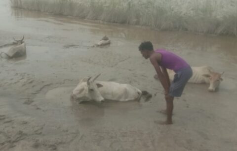सरयू के दल-दल में फसे बेसहारा जानवरों को ग्रामीणों ने निकाला